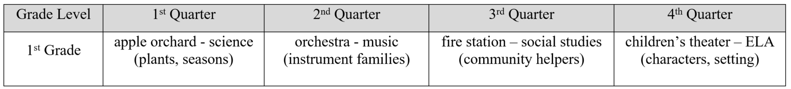 Unless you intentionally map out and plan for “experiences,” it’s easy for these to fall through the gaps. Begin by listing any field trips or other hands-on, context-building experiences you already provide for students. Organize them by grade level and note their connections to the curriculum (see the chart below).