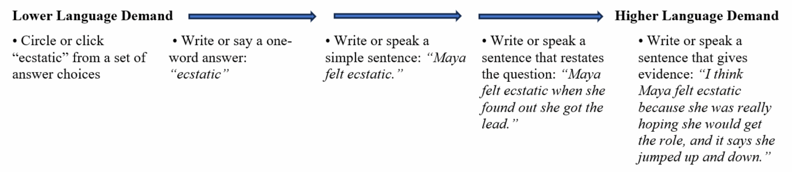 When it comes to expressive (spoken or written) language, expectations of students are much higher at some schools than at others. Take a look below at several ways to answer the same question on a scale of lower to higher language demand.